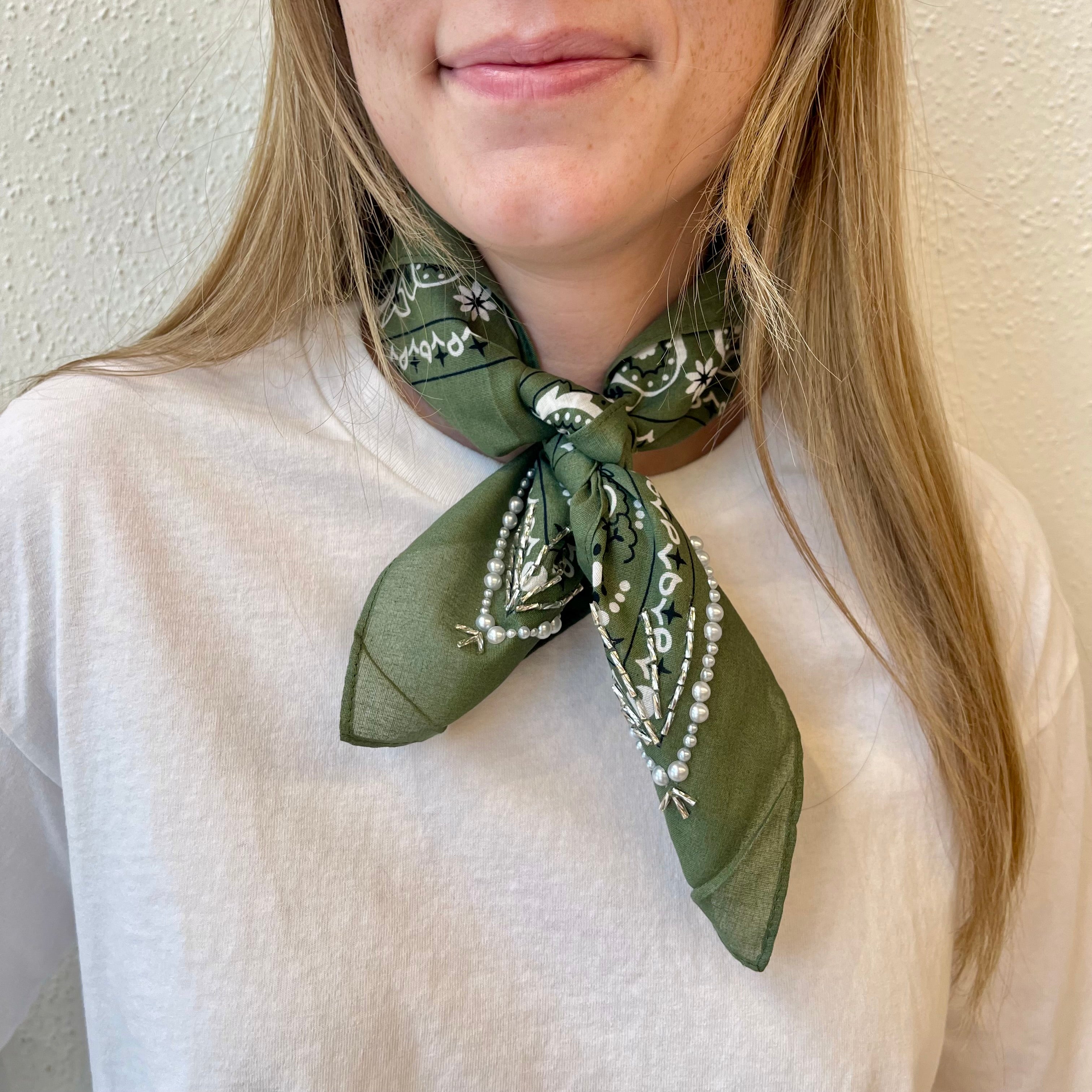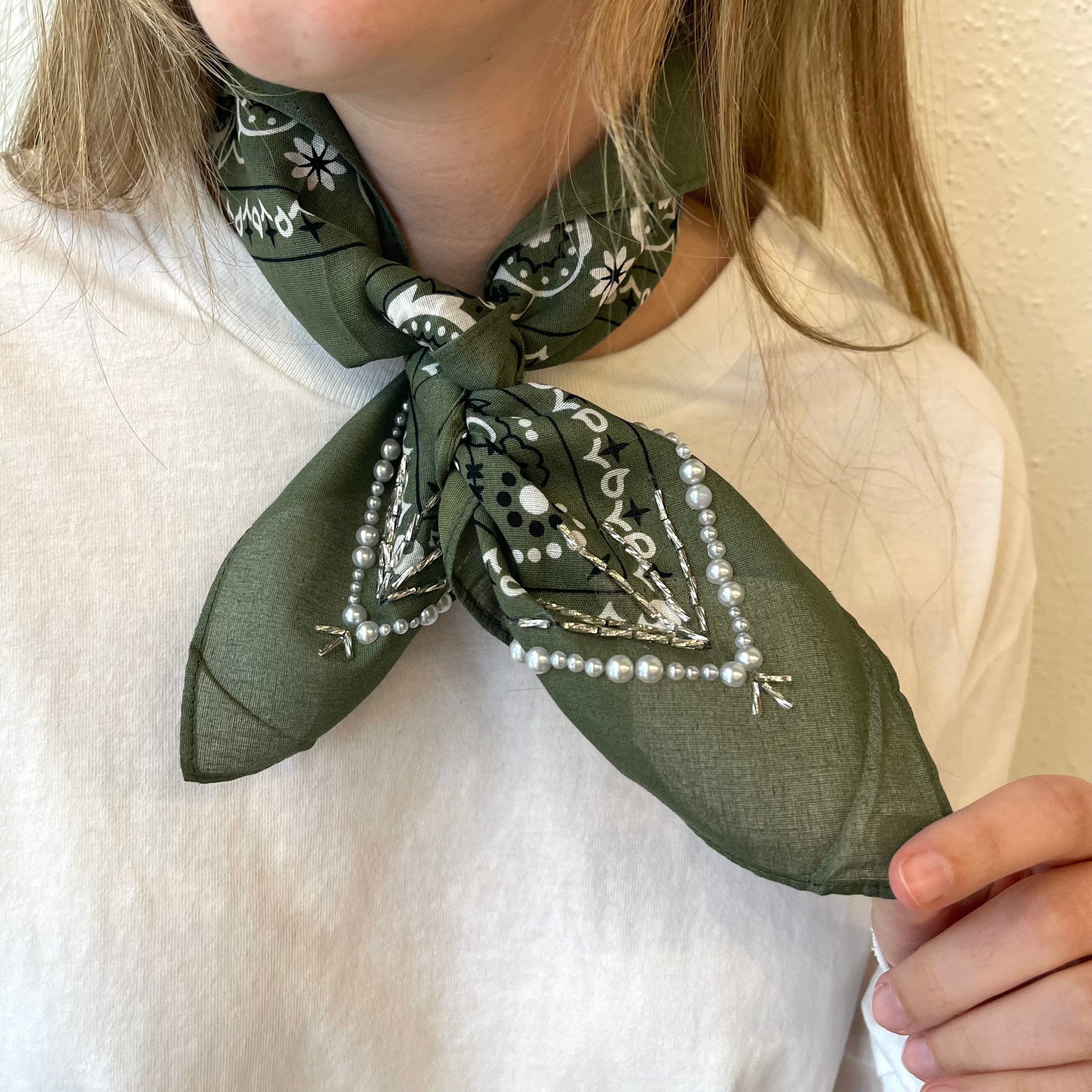 Super soft embellished bandana with pearl beads affixed around the corners.