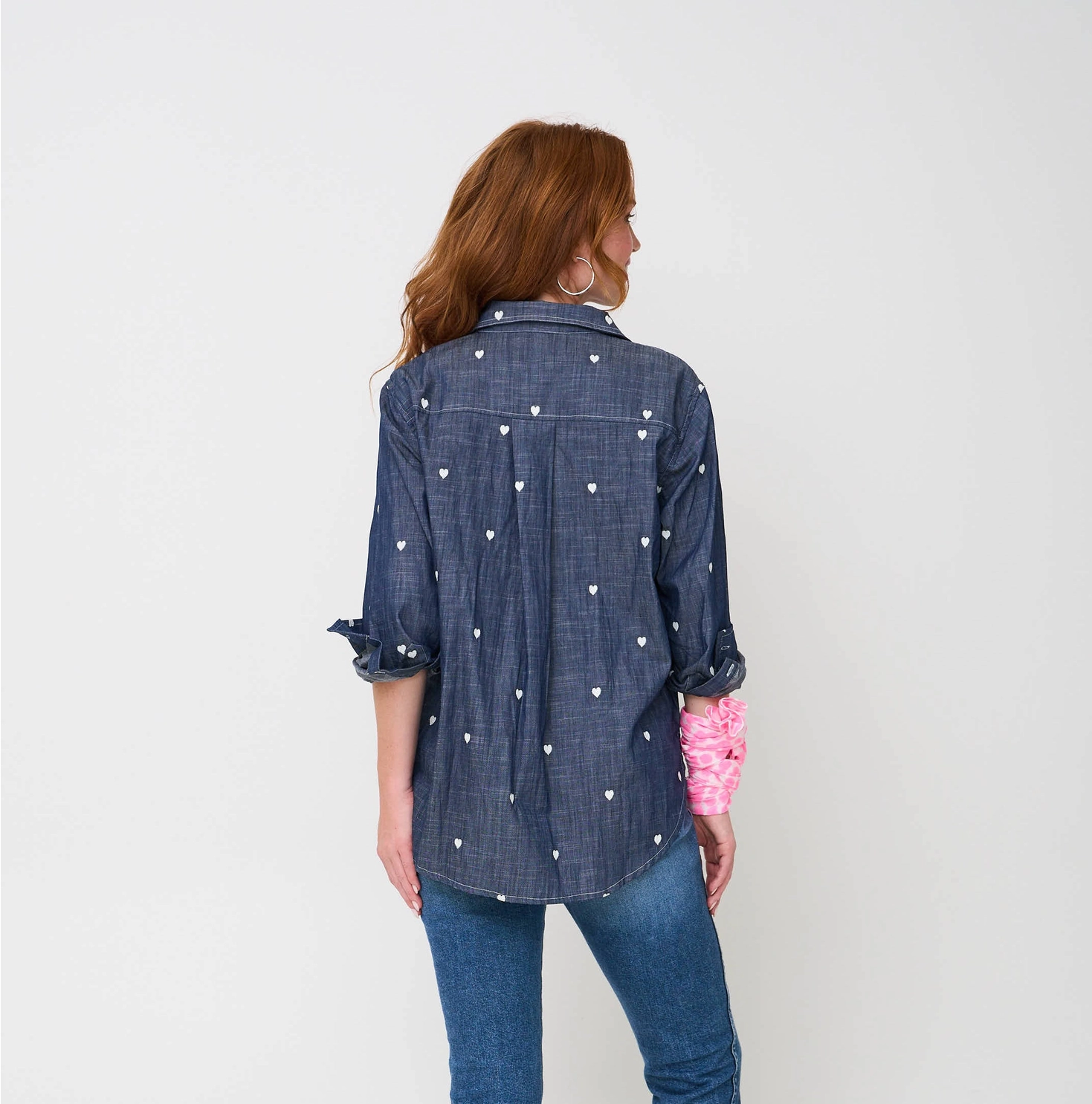 The good boyfriend long sleeve button down shirt is a comfortable and effortlessly cool wardrobe staple with a sustainable story. From its origin of GOTS certified organic chambray hand construction and sewing of garment; the entire lifecycle of production is sustainable and keeps the heritage of artisan practices alive. The final step is the all over heart embroidered design with heart shape pocket. This shirt gets even softer and gets better with every wear, sure to become your comfy favorite! With its relaxed, modern fit, and casual silhouette, the good boyfriend shirt offers endless styling options and ways to wear this eco-fashionable favorite.