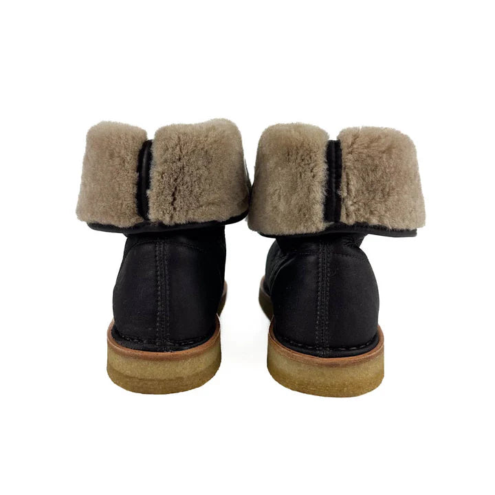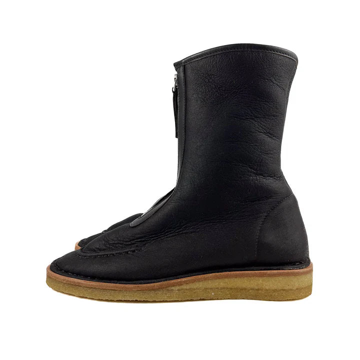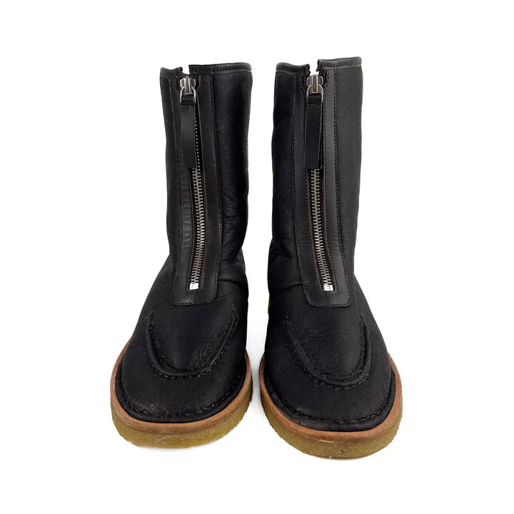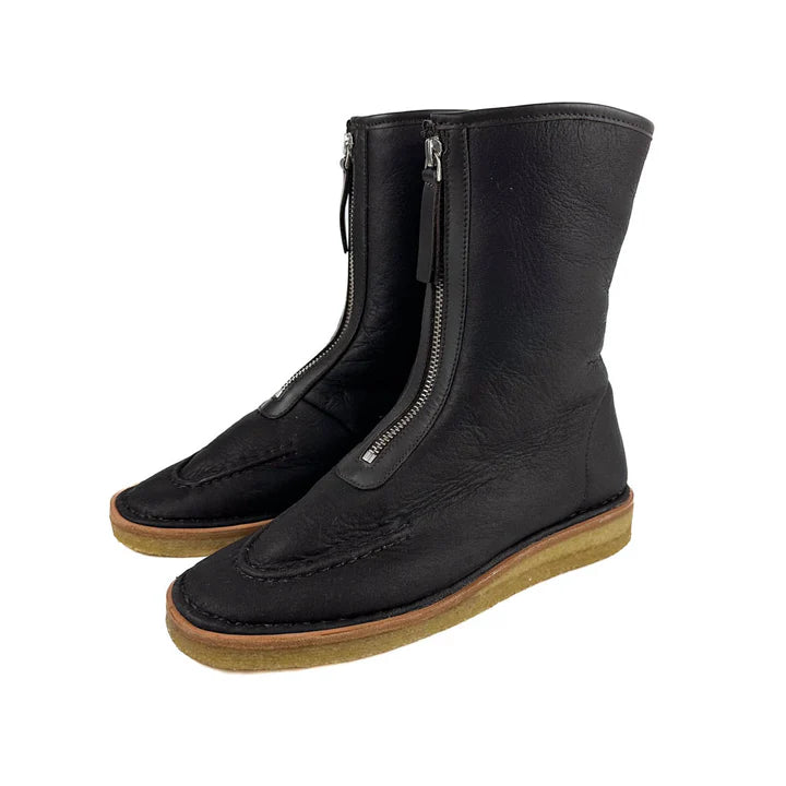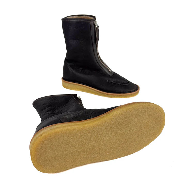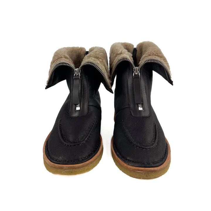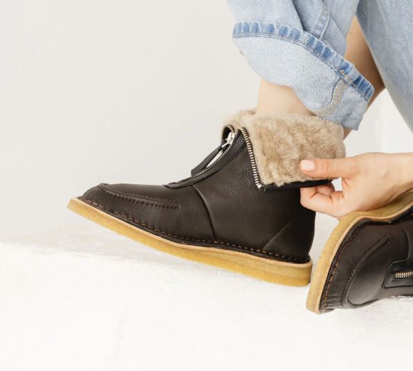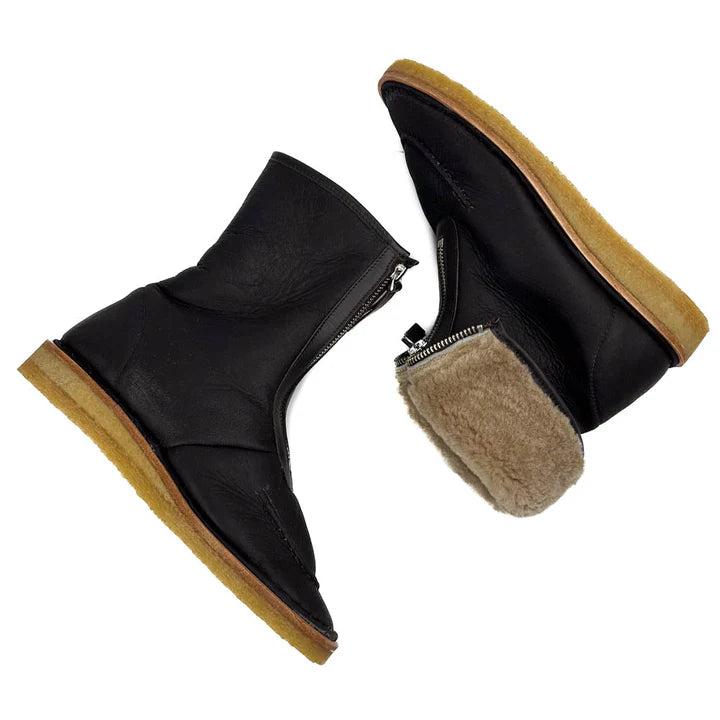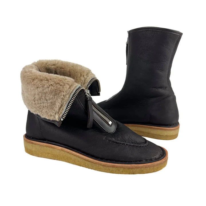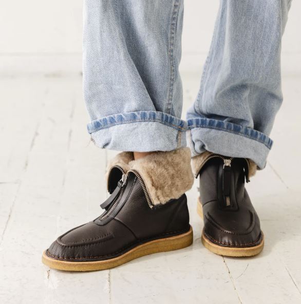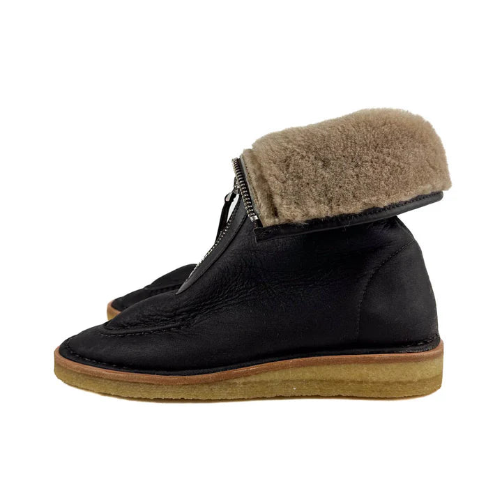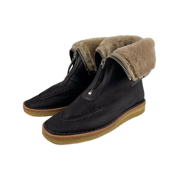 Chic and cozy, this style is crafted from soft leather and lined with even softer shearling natural wool shearling. Blending warmth and comfort, with a natural crepe sole and leather welt construction. An easy front zipper adds a modern detail.