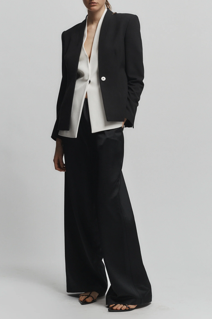 Introducing the Paige Pull-On Pant in Black. Made from Saint Art's signature wrinkle-resistant charmeuse fabric, these pants are both comfortable and elevated with ruched detailing at the waist. Perfect for day to evening wear and travel, these machine washable pants are a bestseller. Upgrade your wardrobe with ease and styl