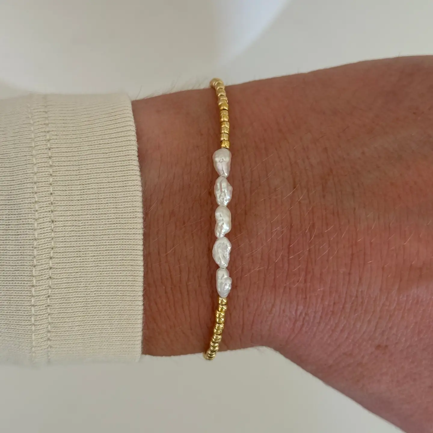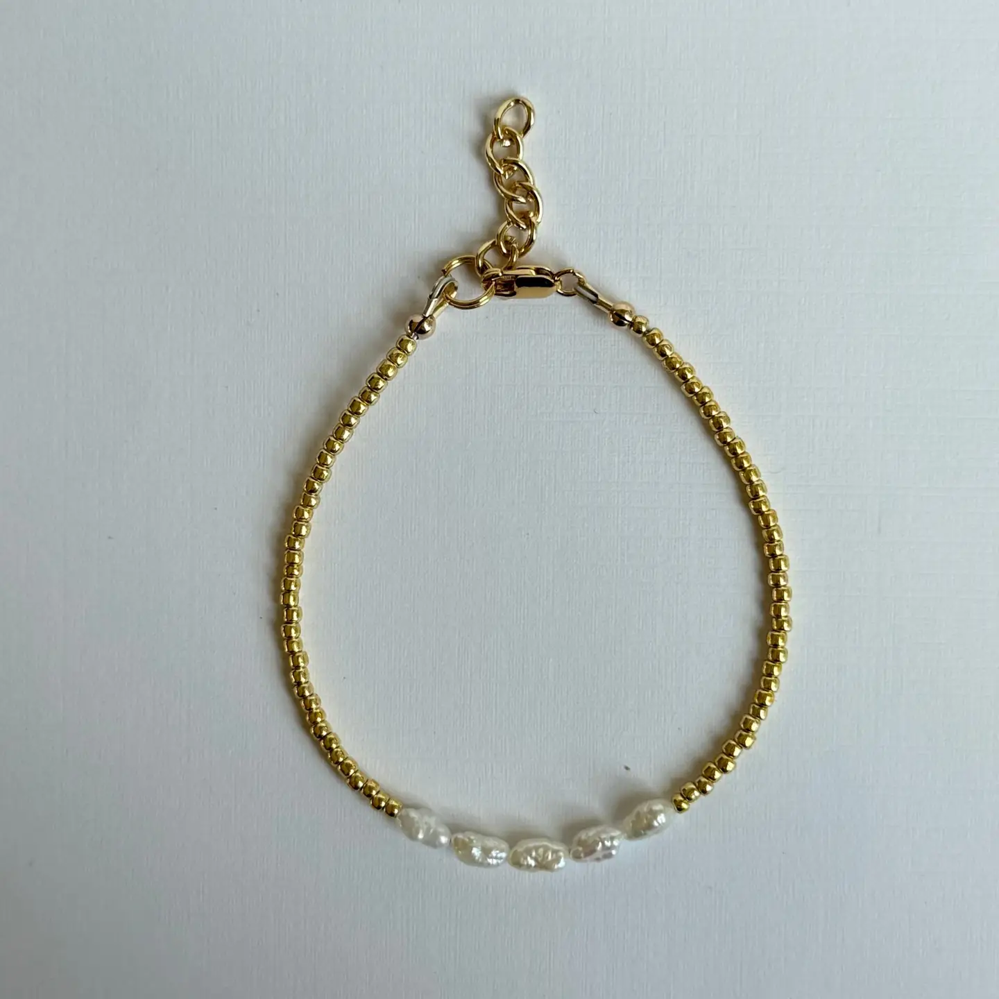 Vintage freshwater pearls threaded between Japanese seed beads in polished gold. A delicate composition, hand-strung and finished with a 14k gold-filled clasp. It feels both quiet and enduring — a piece with history, designed to carry forward. Each pearl is natural and vintage, giving every bracelet its own subtle variation.