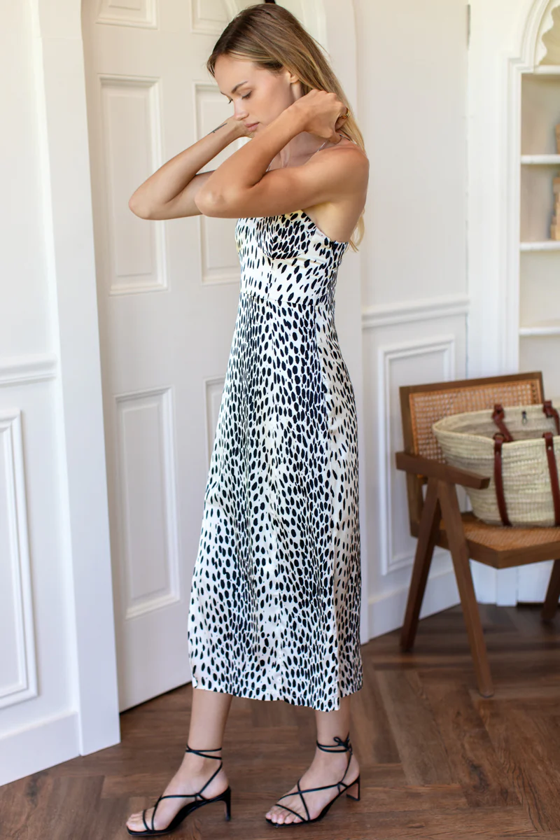 Fitted Bodice Dress in a buttercream leopard print satin.