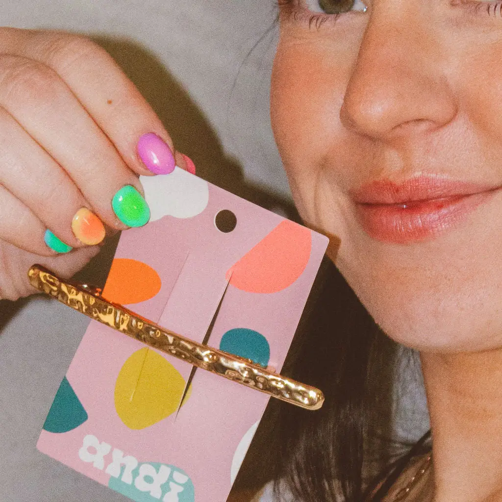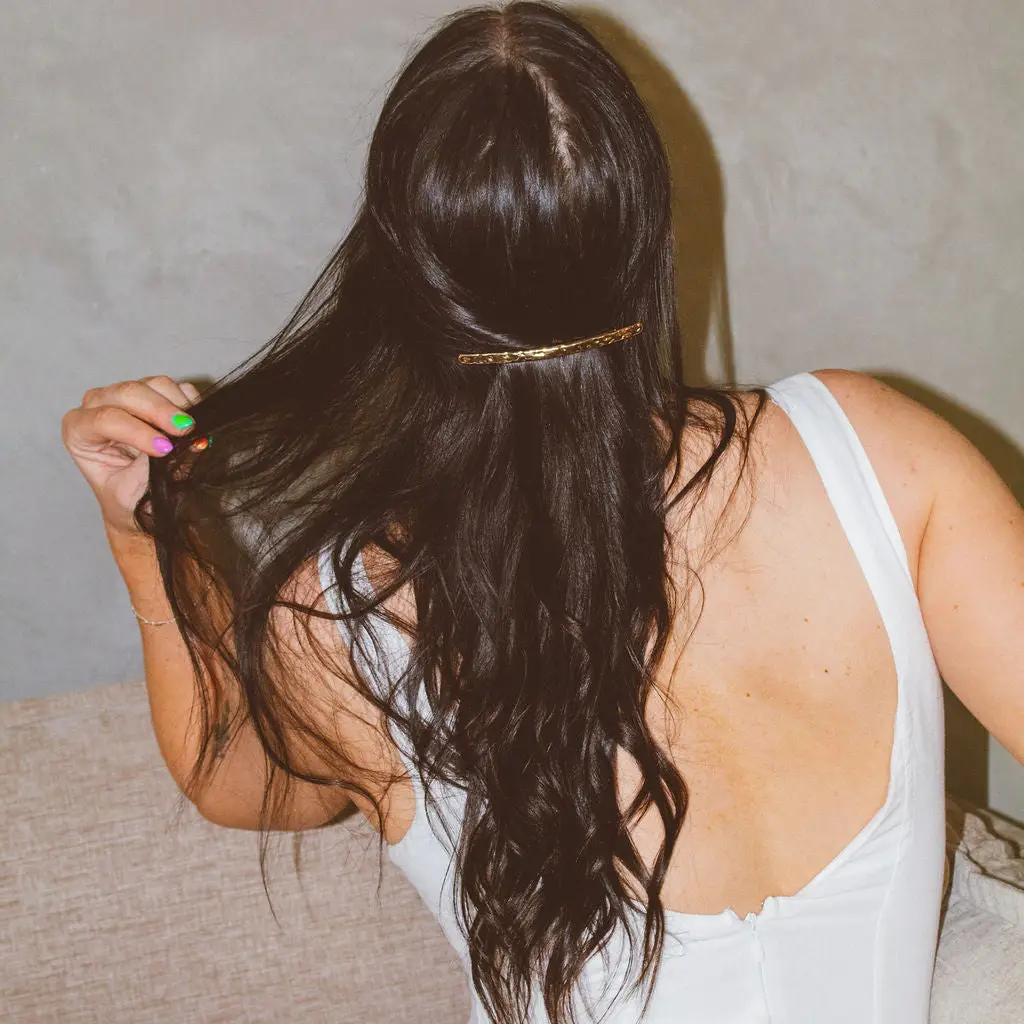 This barrette is by far the easiest, cutest, and simplest way to style your hair. It's an adorable long bar shape, made out of high-quality gold metal with a bumpy texture. These will be your go-to accessory all year!