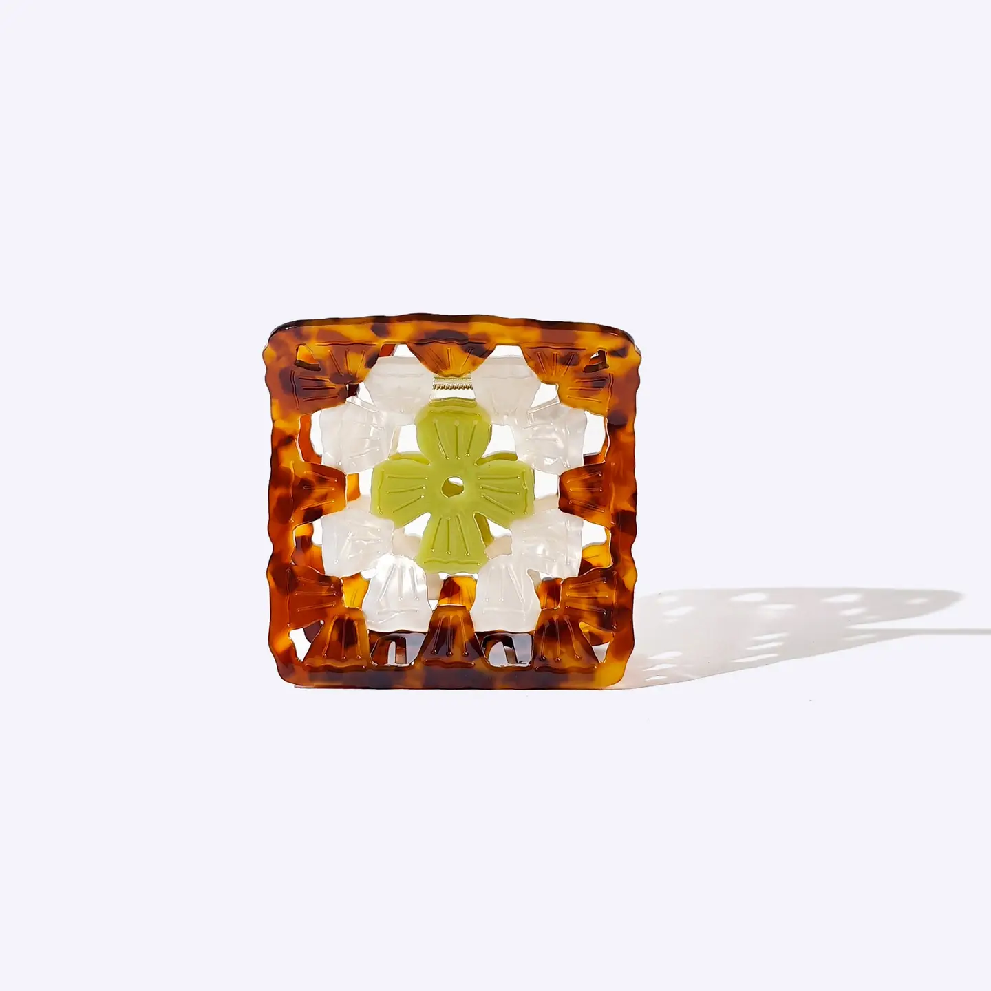 A claw clip for girls who have been 75 years old since birth. Designed to look like a crocheted granny square, the Granny Square Claw features multiple layers of colored acetate with cutouts and engraved detailing.