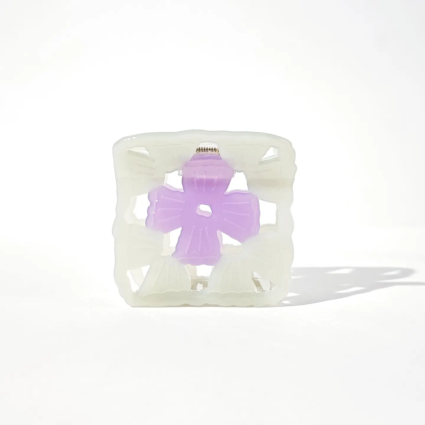 A claw clip for girls who have been 75 years old since birth. Designed to look like a crocheted granny square, the Granny Square Claw features multiple layers of colored acetate with cutouts and engraved detailing.