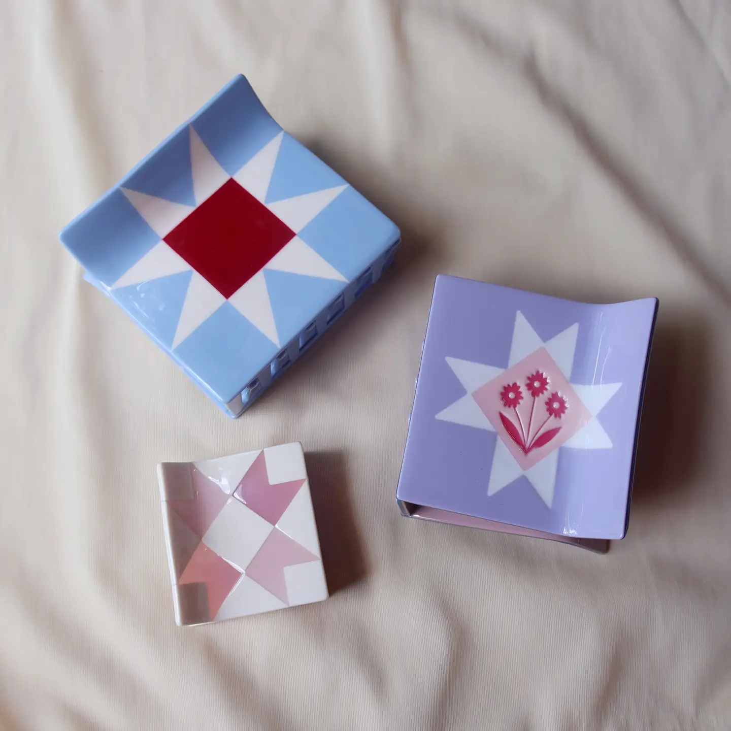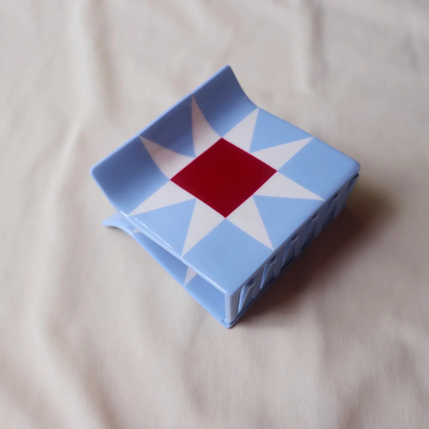 Quilt love in a claw clip. The Lana Quilt Claw features a traditional quilt block pattern laid into a super strong hair clip. This extra large claw is best suited for longer and thicker hair types and comes in a vintage Americana colorway with blue, white, and maroon.
