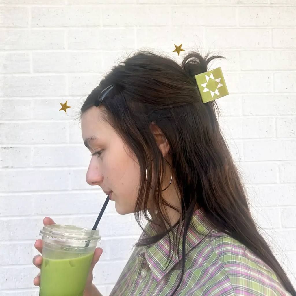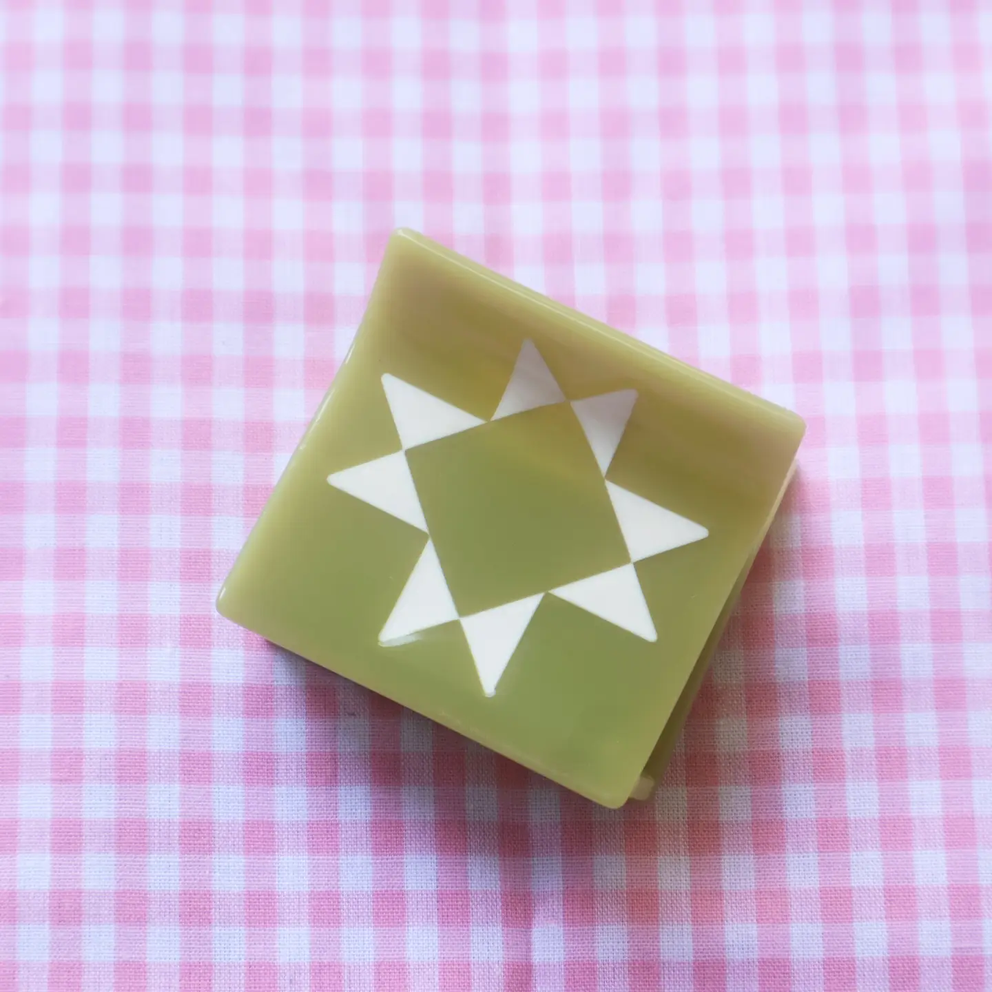 Quilt love in a claw clip. The Matcha Quilt Claw features a traditional quilt block pattern laid into a super strong hair clip. This small claw is best suited for all hair types and comes in a bright matcha green with white inlay.