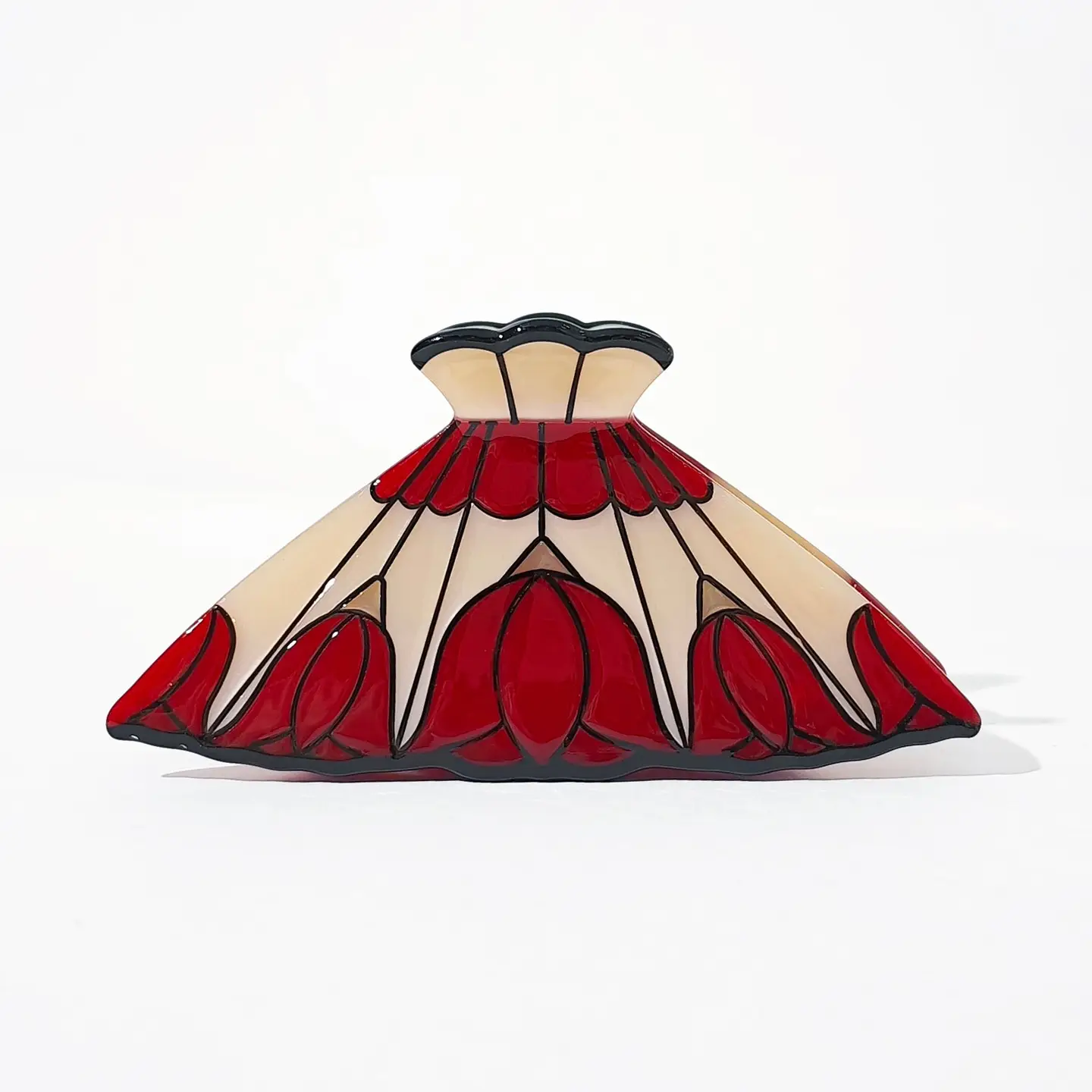 A whimsical hair accessory inspired by vintage stained glass design, the Rose Lamp Claw is a small to mid sized claw clip. Featuring dark red flowers spliced into a champagne background, the Rose Lamp Claw adds a classical touch of romance to your style.