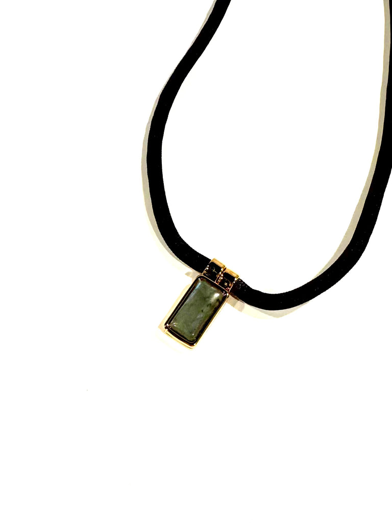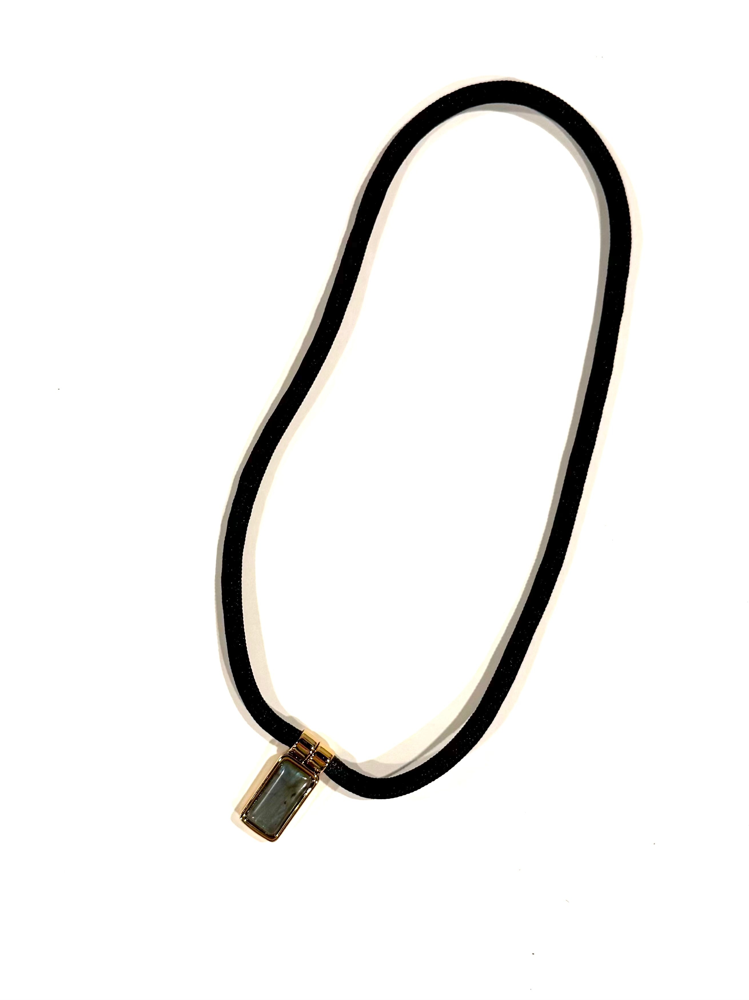 Black cord necklace featuring an Labradorite stone pendant encased in gold plated brass