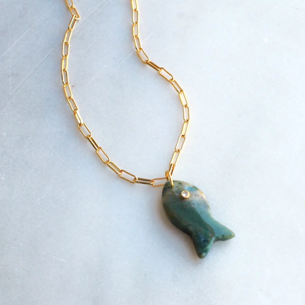 The Silver Wren - Large Gemstone Fish Pendant Necklace (Green Apatite)