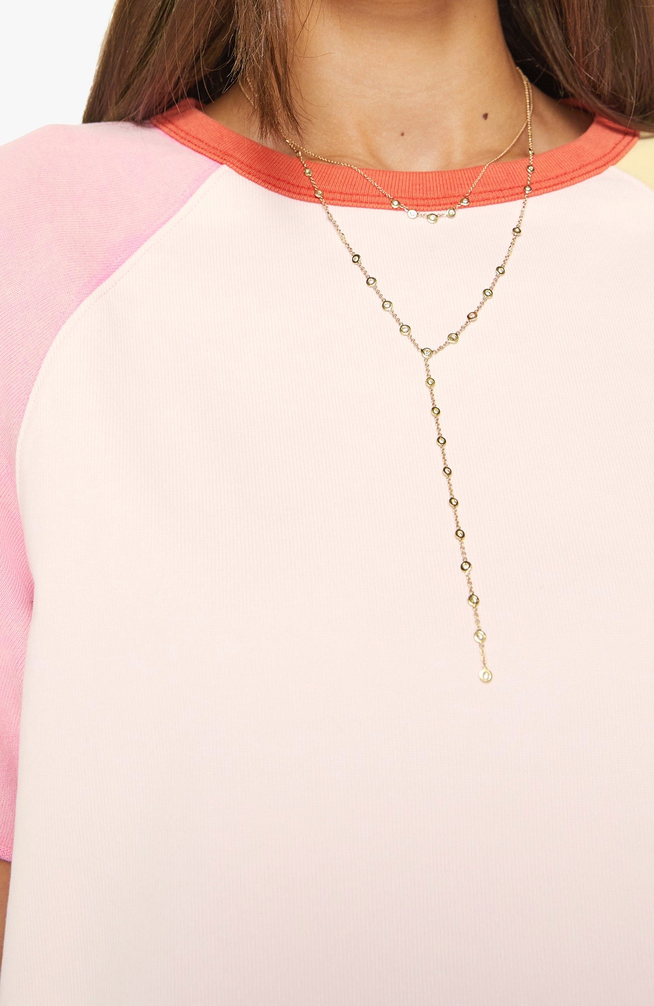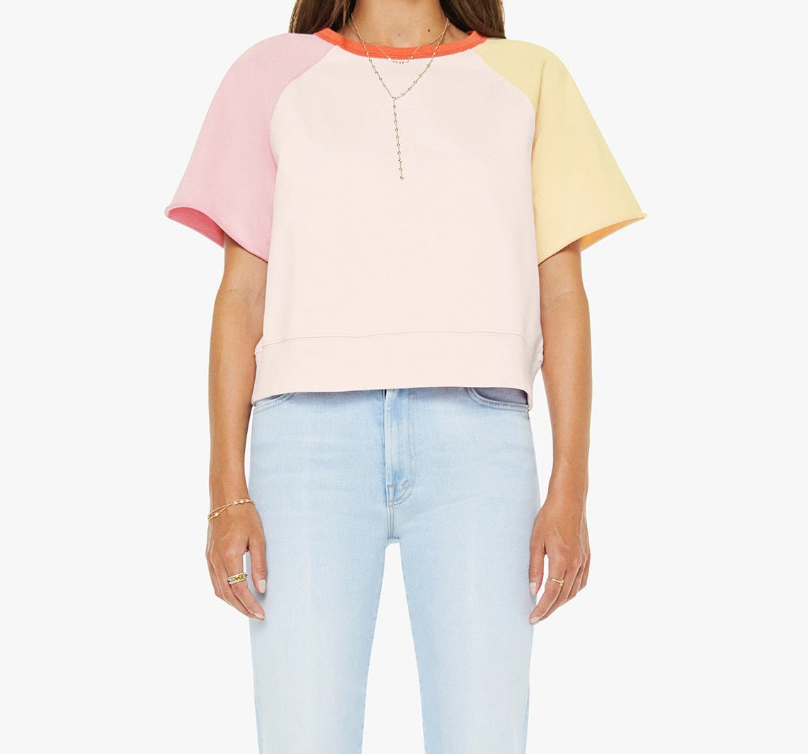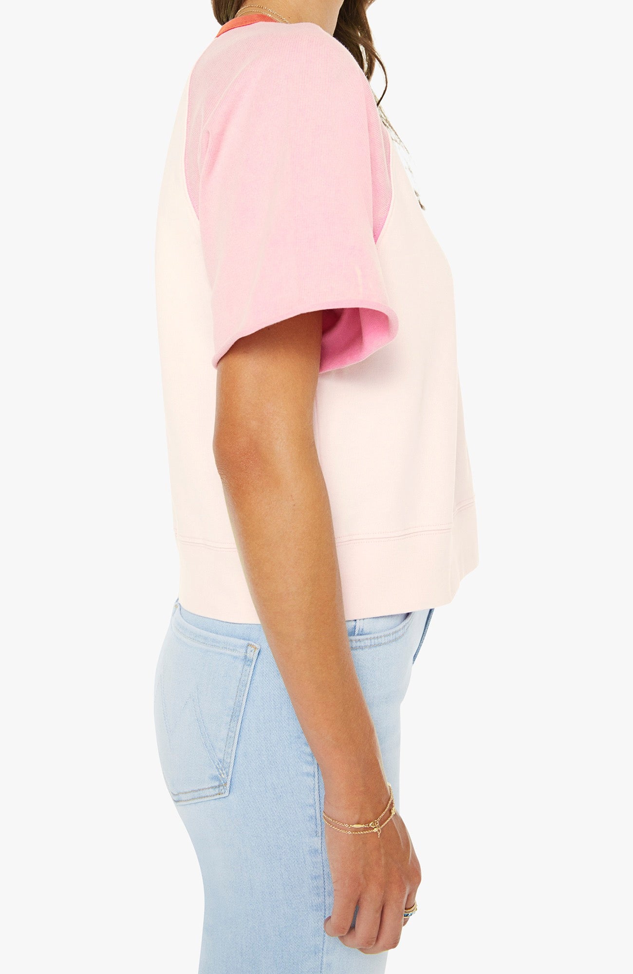 A crewneck sweatshirt with cut-off sleeves and a cropped, ribbed hem. Made from 100% cotton, the top is designed in pale peach, baby pink and pastel yellow with orange trim at the neck.