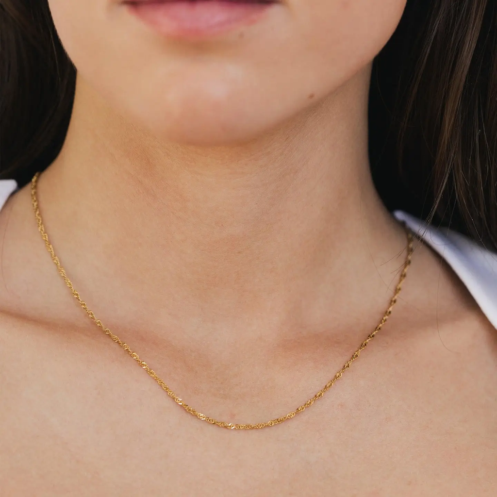 The Singapore Chain Necklace boasts a beautiful twist chain. Its delicate dainty appearance makes it perfect for layering and adding a touch of elegance and texture to any outfit. Check out our charms for a more versatile look.