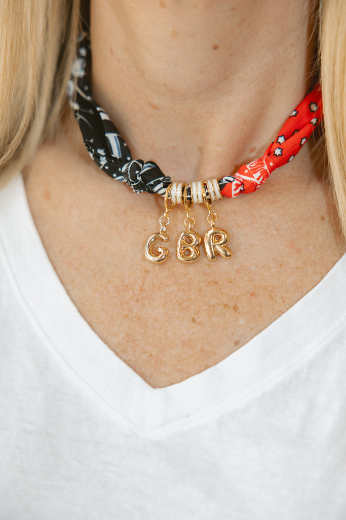 Show off your team spirit in style with our custom GBR scarf necklace or wrap bracelet, featuring 18k gold puffy letter charms. This unique accessory combines a soft satin fabric with luxe gold details for a fun, spirited look that’s perfect for game day or any day.