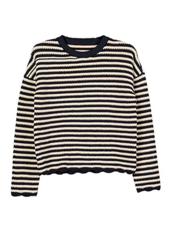 The Febo Pullover in Navy Stripe is a women’s cotton-blend crochet knit sweater in midnight navy and white.