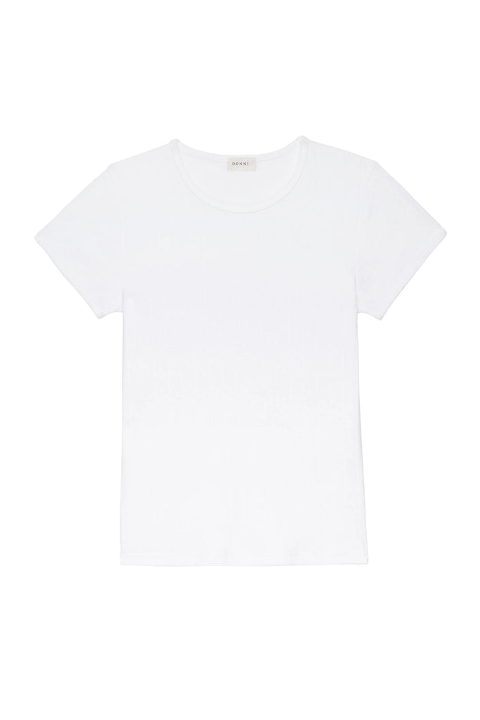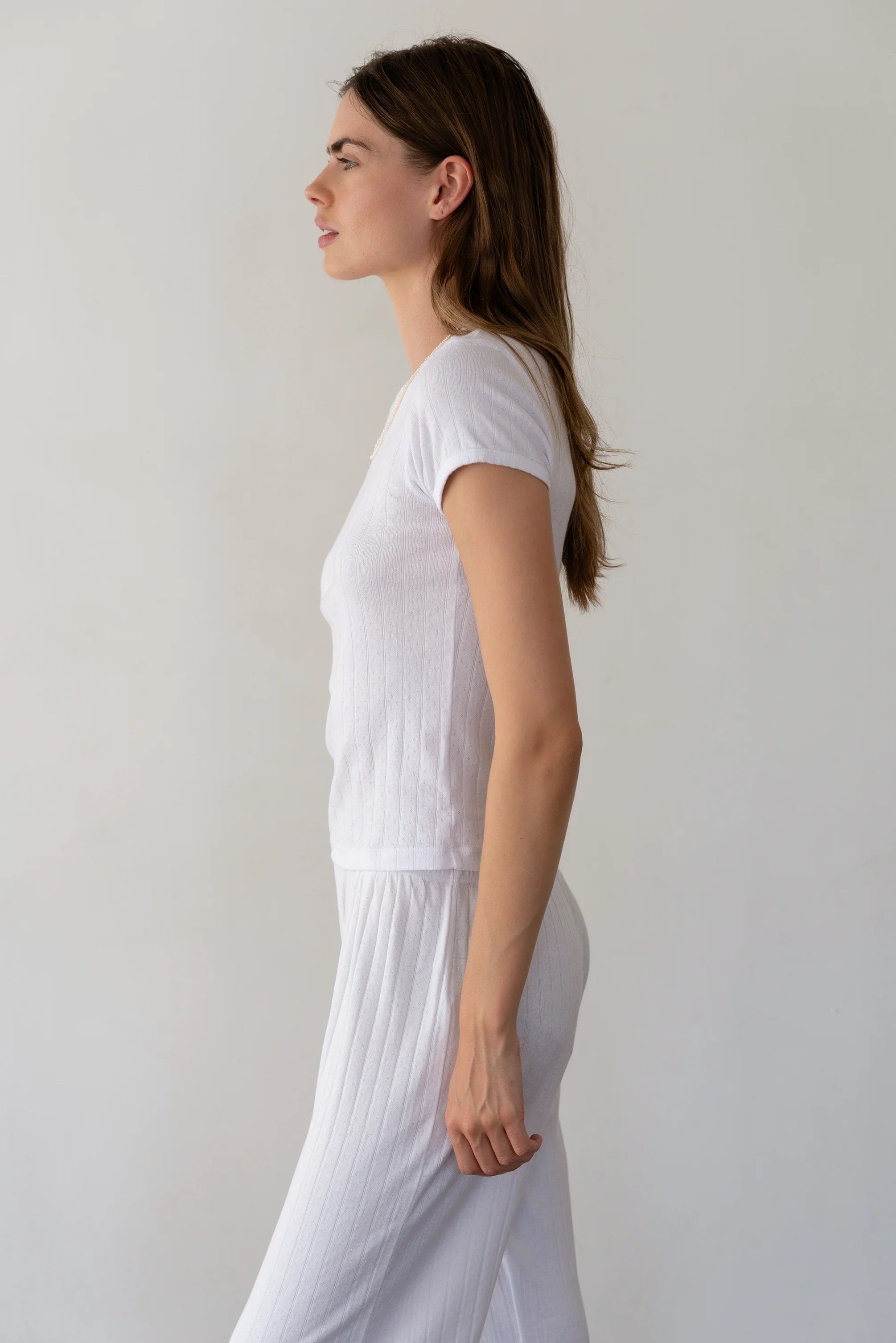 The Pointelle Baby Tee is crafted from lightweight 100% organic cotton. With a timeless pointelle knit, classic crew neckline, and cap sleeves, it skims the body for a flattering fit—an easy essential for every season.