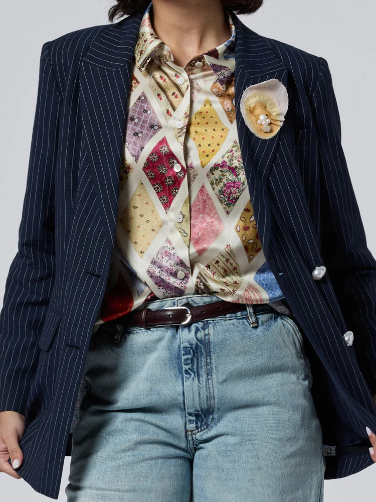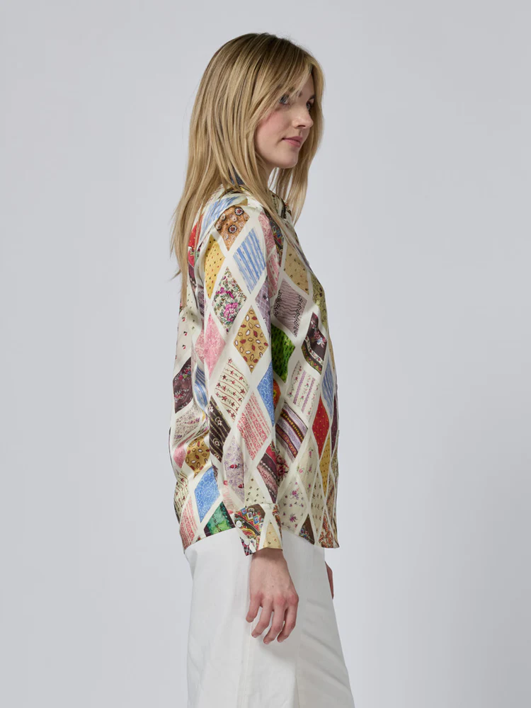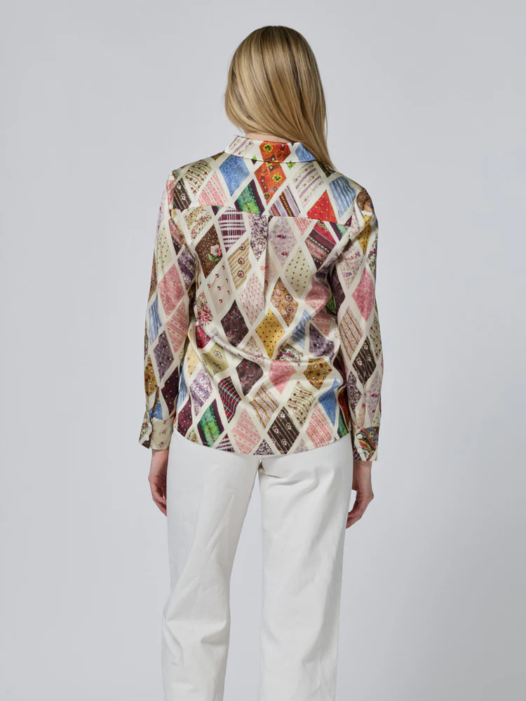 The Emerson Button Up Shirt is a women’s silk satin button-down blouse featuring a diamond-print motif and a relaxed fit through the body and sleeves for effortless drape and movement. Crafted from a fluid silk-blend, it feels lightweight and smooth against the skin, elevating a timeless wardrobe staple.