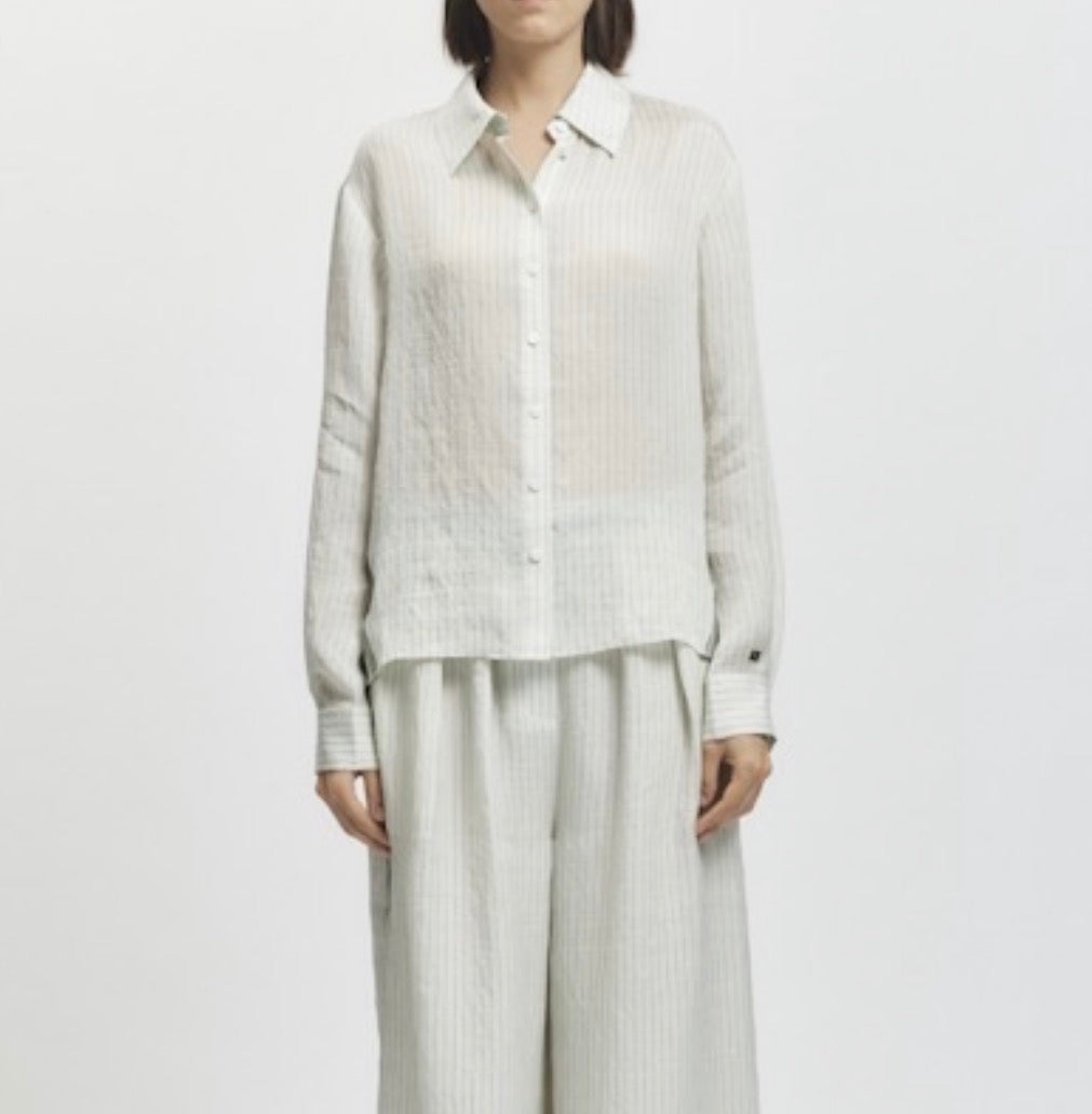 A relaxed button up in mint pinstripe.