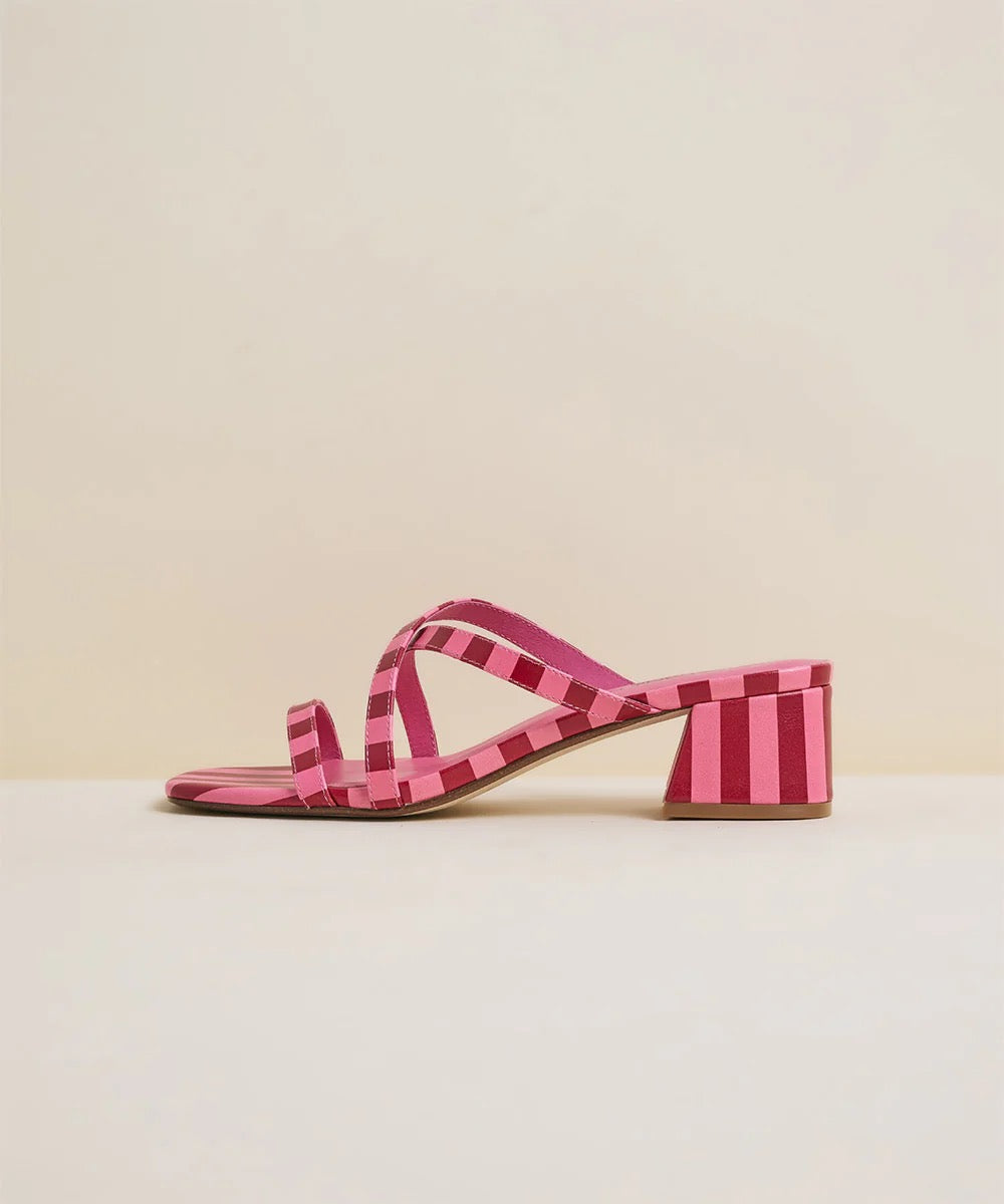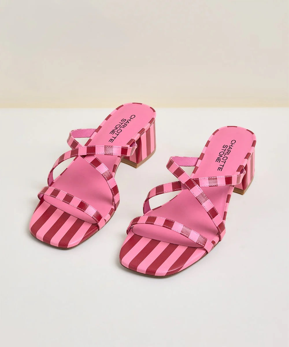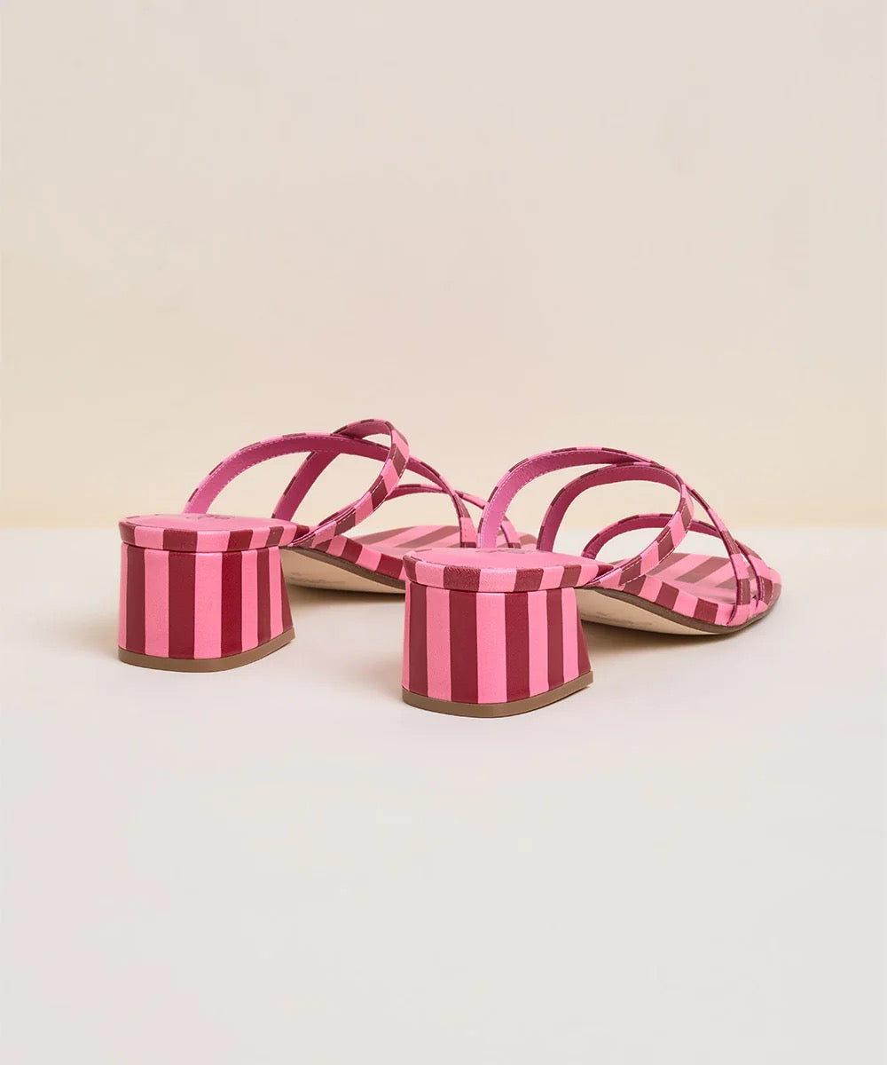 An open toe low heel in eye-catching striped leather with criss-cross straps.