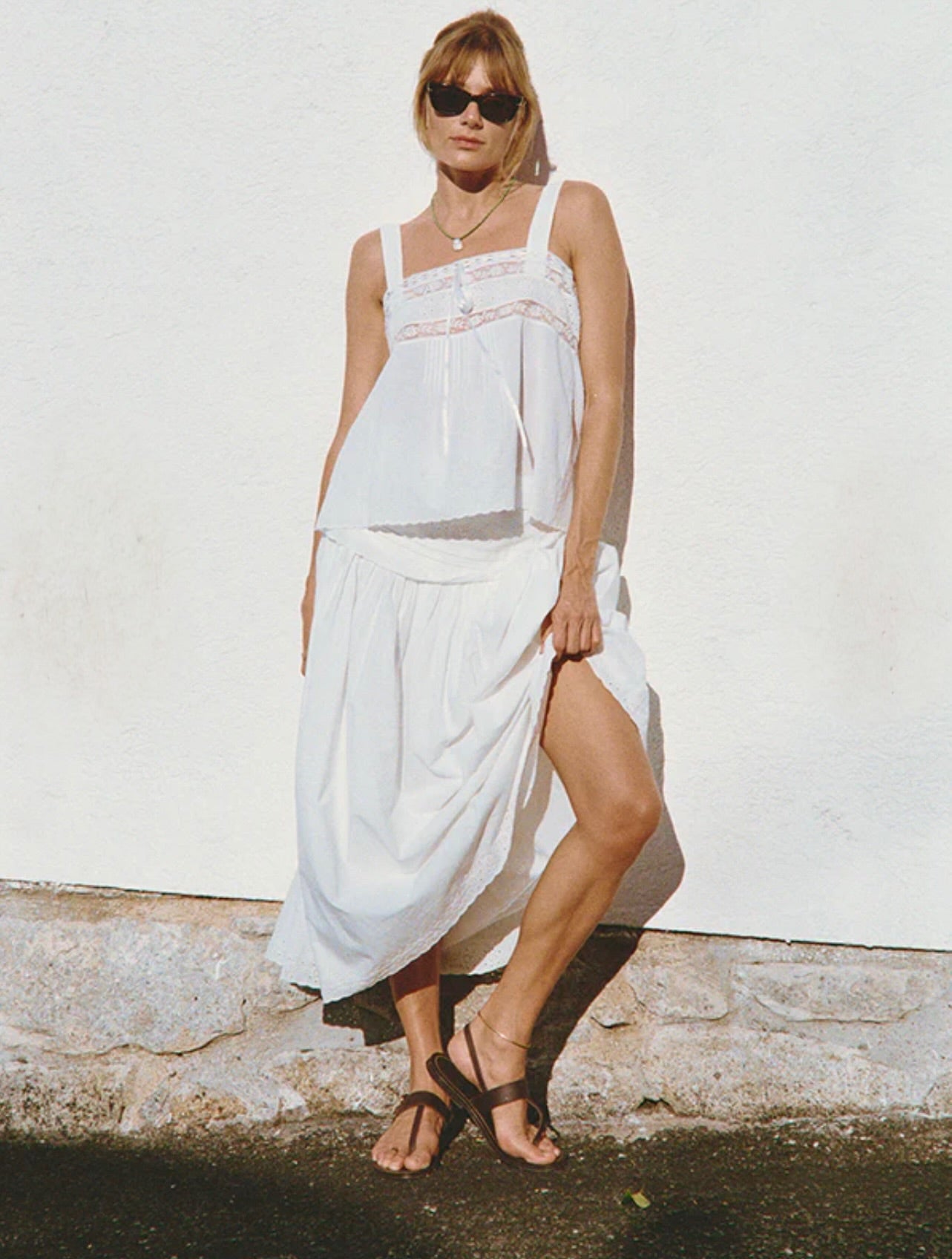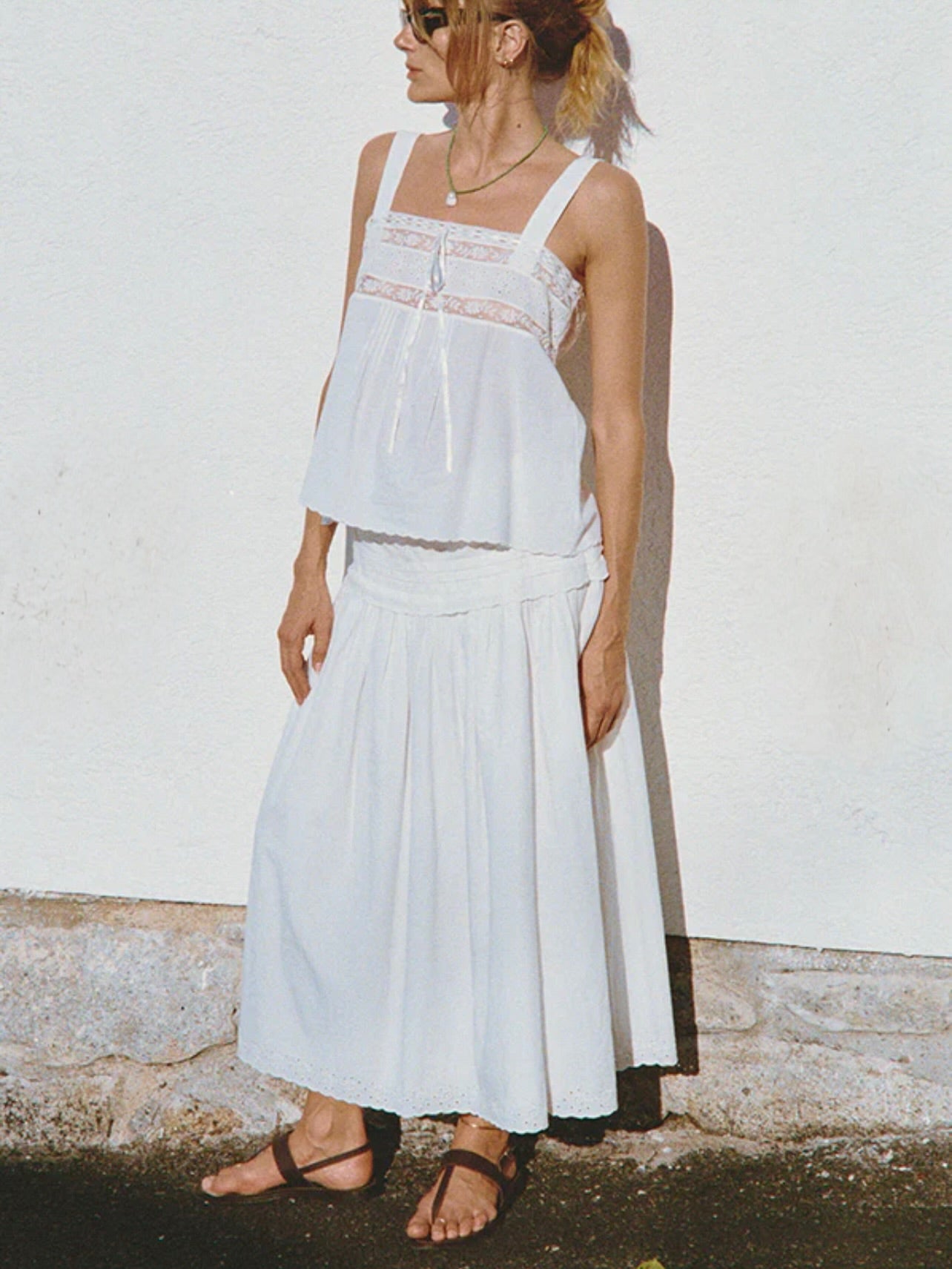The Euri Top in White Embroidered Cotton is a sleeveless top with lace detailing across the chest, embroidery along the hem, and tied with a ribbon bow in front.