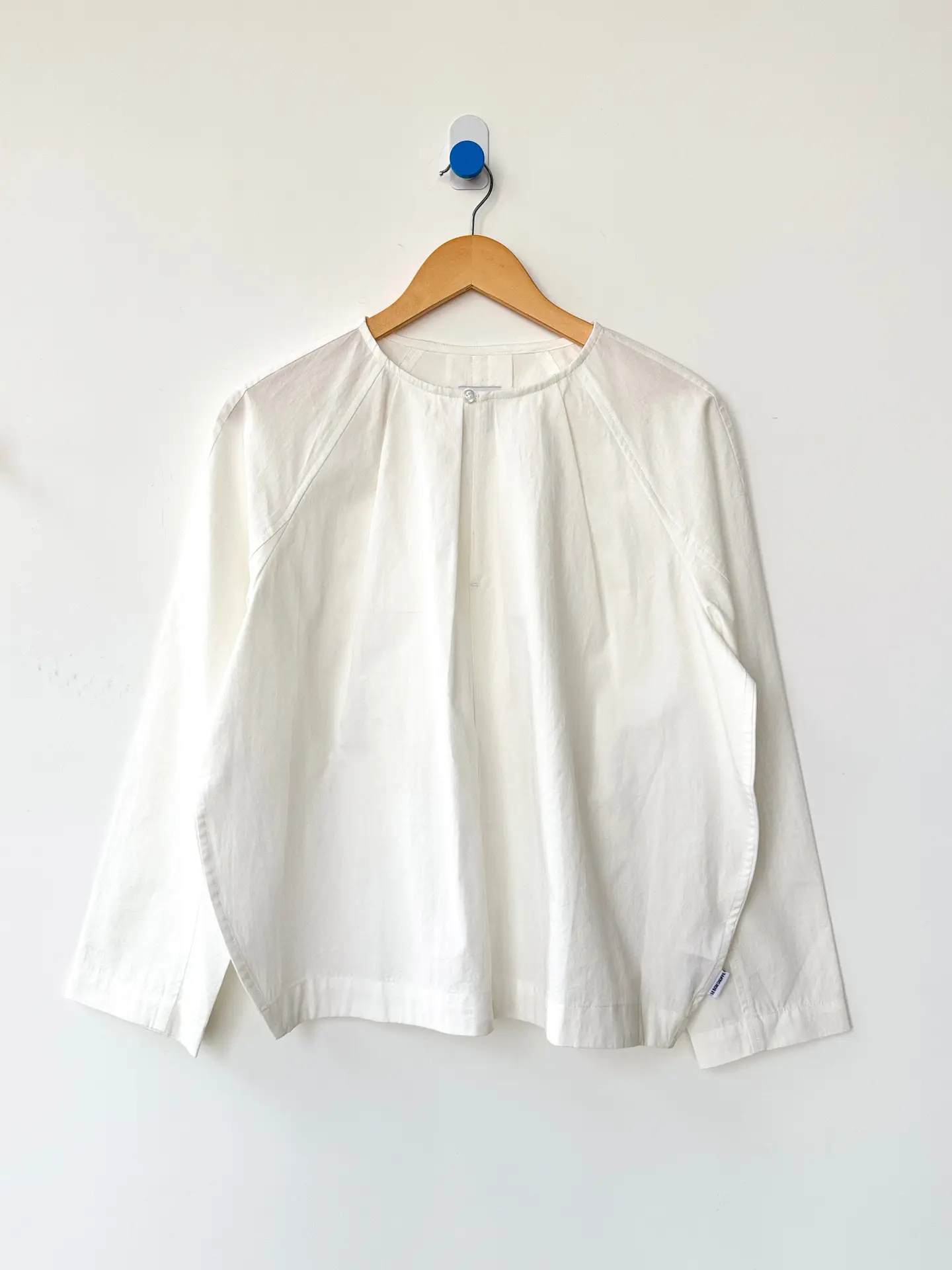 A nod to the ever-evolving blouse, the Julienne Top features thoughtful design details that speak for themselves. A round neckline with a front keyhole closure sits at the center of delicate pleating and charming raglan sleeves. It maintains a relaxed, slightly curved shape, making it easy to wear both tucked or untucked. Its lightweight cotton texture is crisp and airy—a dreamy staple for dressing up or keeping it casual.