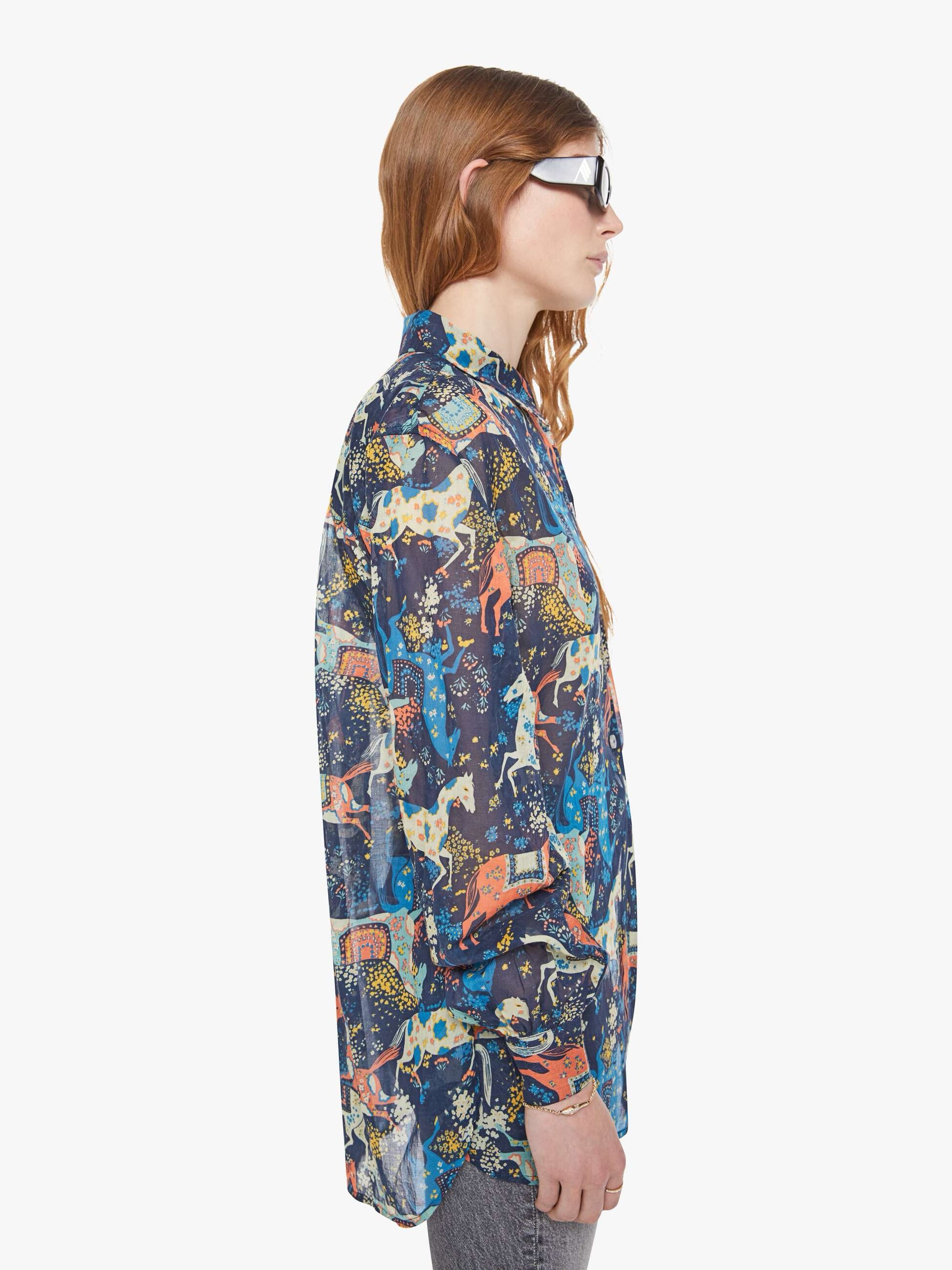 A button-up blouse with long balloon sleeves and an extra-long hem. Made from sheer 100% cotton, Horse Around is designed in navy blue with a folk art-inspired horse print throughout.