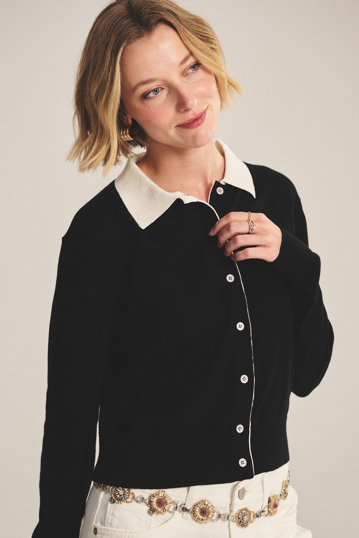 The Riven is a cotton-cashmere blend cardigan with contrast stitching and a matching collar. It's an easy, lightweight addition to any outfit.